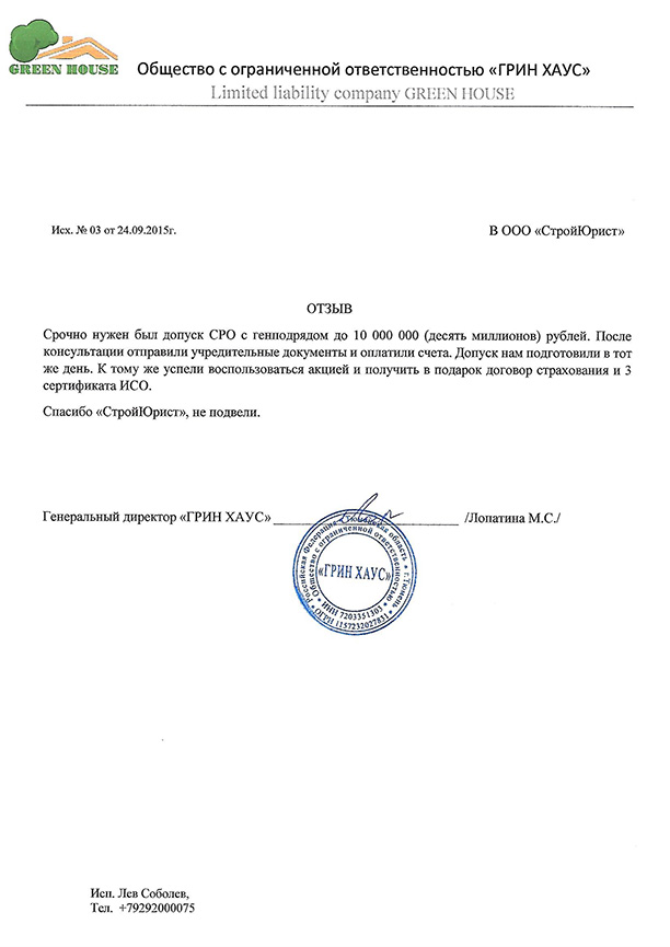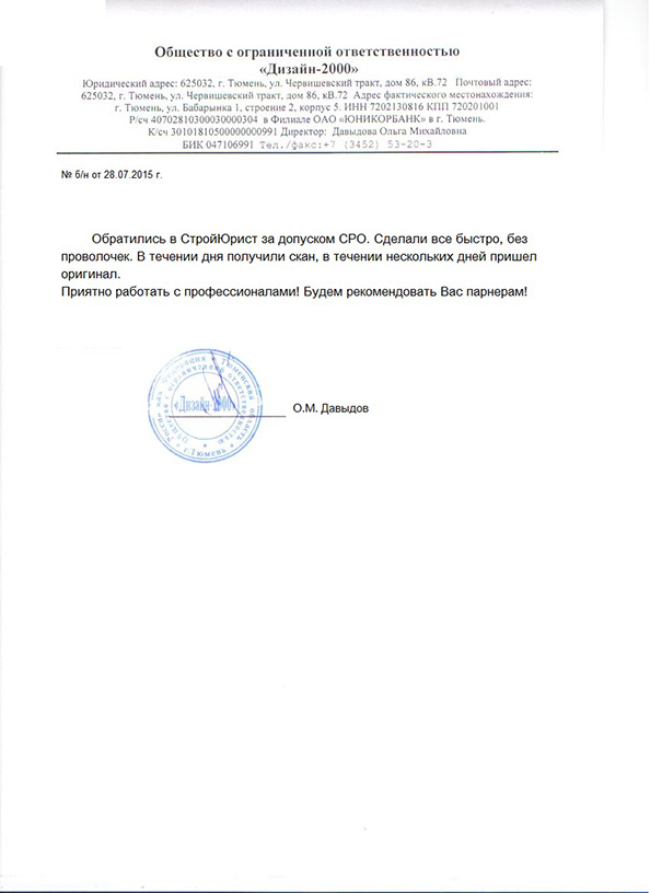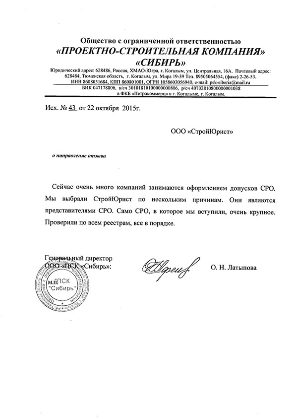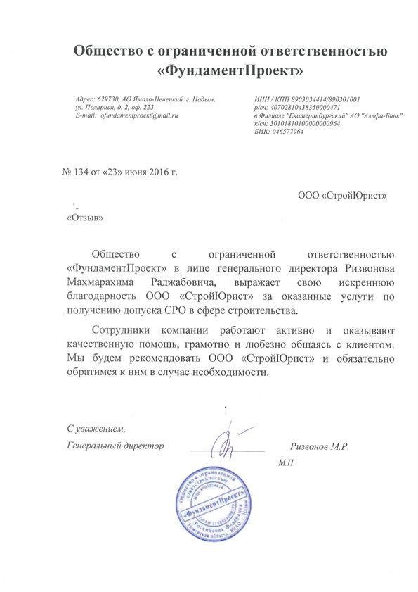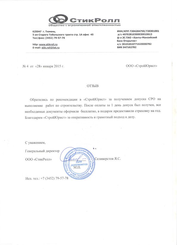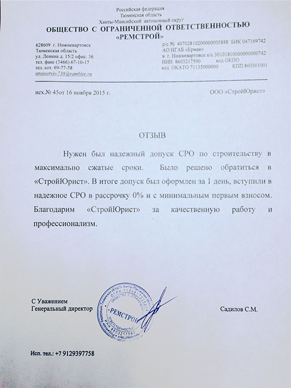 Отзывы клиентов "СтройЮрист" по вступлению в СРО в Стерлитамаке