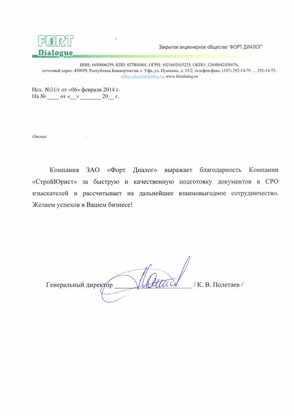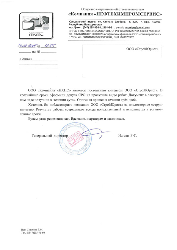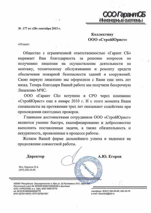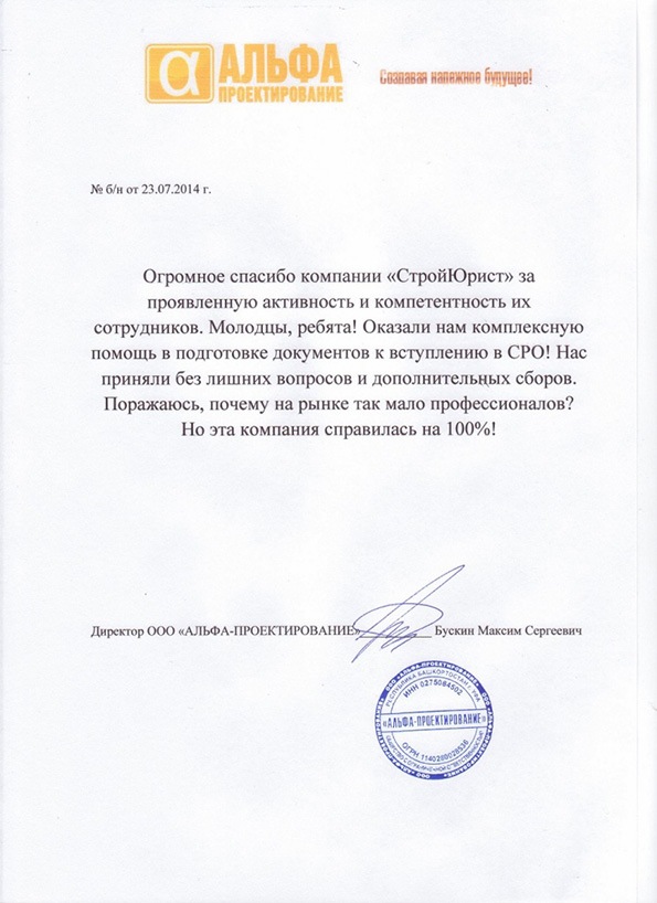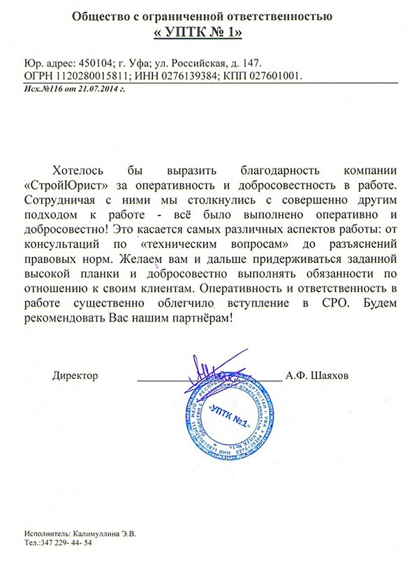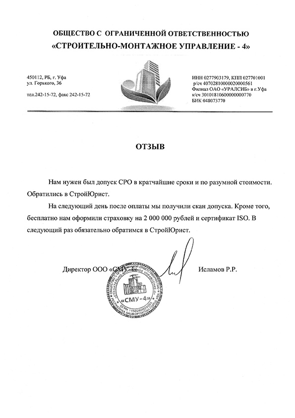 Отзывы клиентов "СтройЮрист" по вступлению в СРО в Стерлитамаке