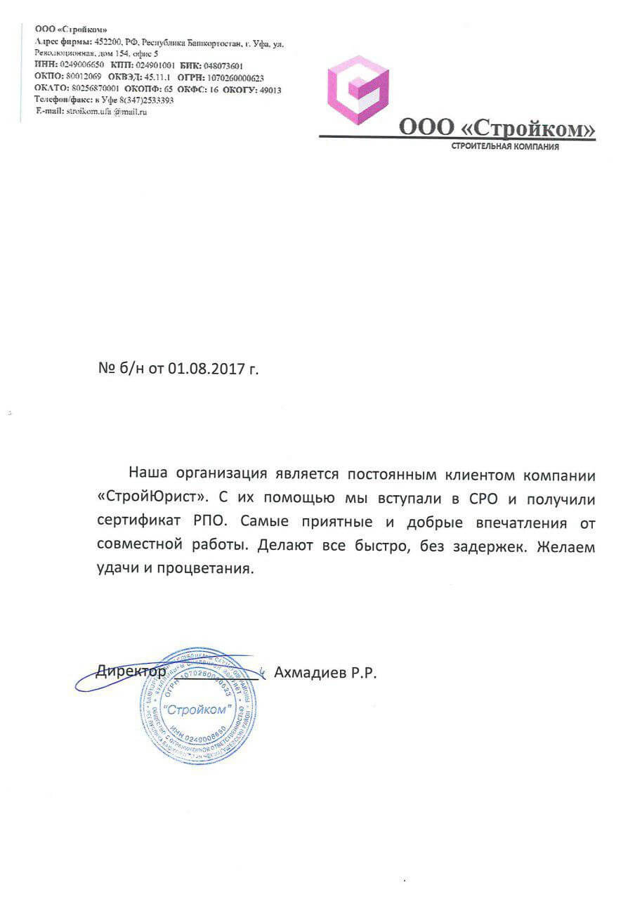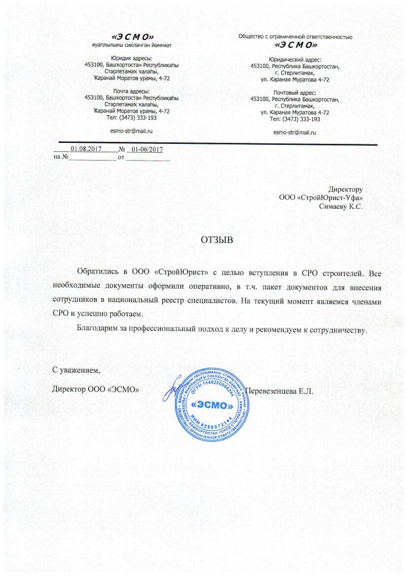 Отзывы клиентов "СтройЮрист" по вступлению в СРО в Стерлитамаке